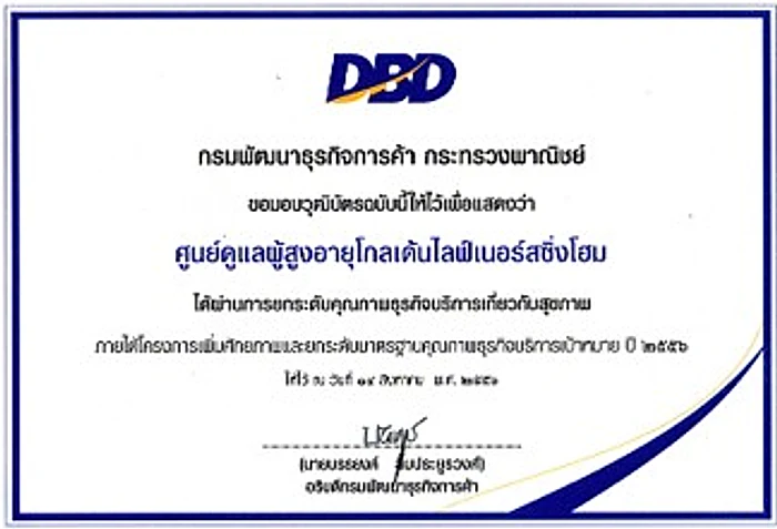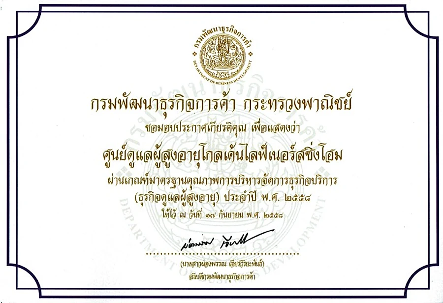 ผ่านเกณฑ์มาตรฐานคุณภาพการบริหารจัดการธุรกิจบริการดูแลผู้สูงอายุจากหน่วยงานรัฐและองค์กรระดับสากล